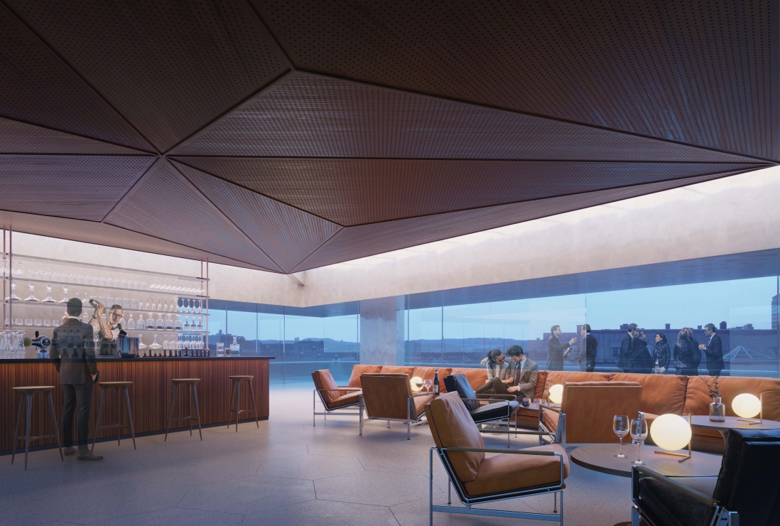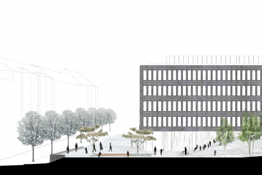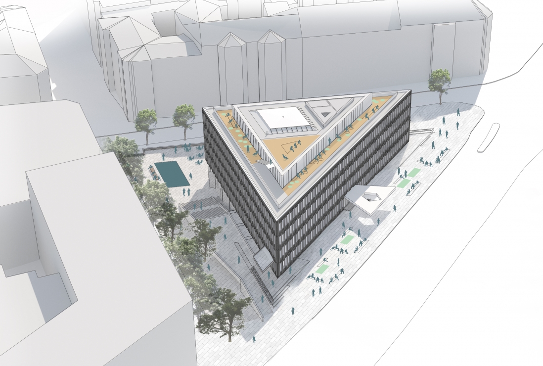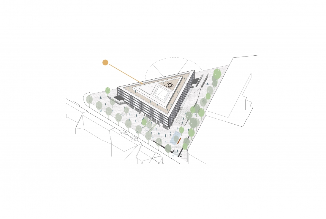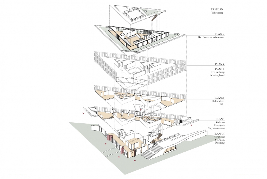 Løsningen viser at store deler av bygget åpnes for publikum, Saarinens raffinerte arkitektur settes nennsomt i stand, taket bearbeides med en inntrukket takhage og etablering av Oslos råeste bar.