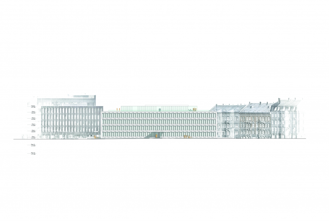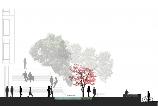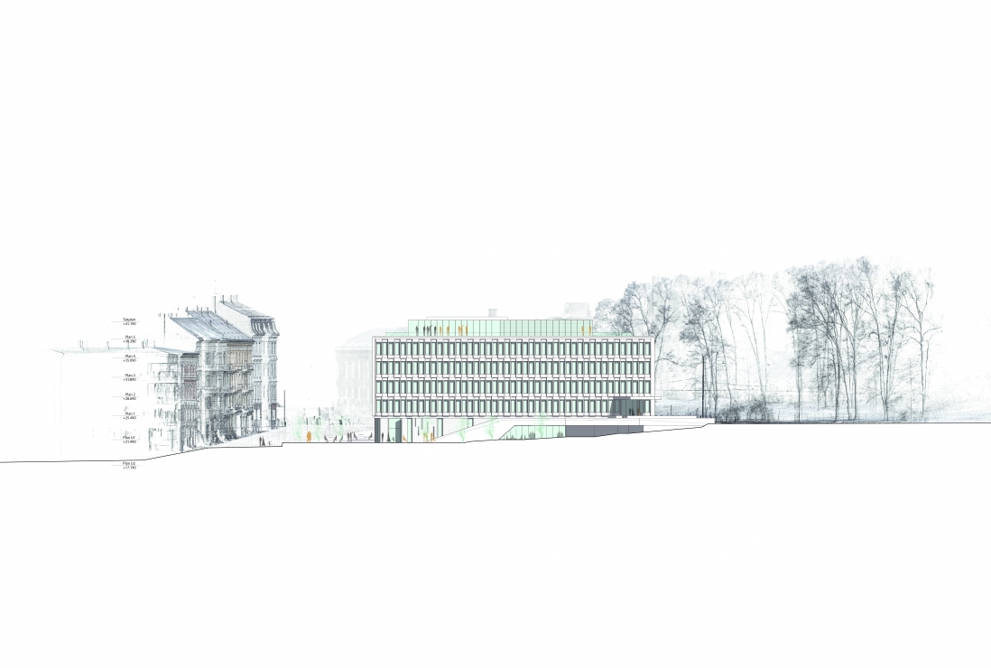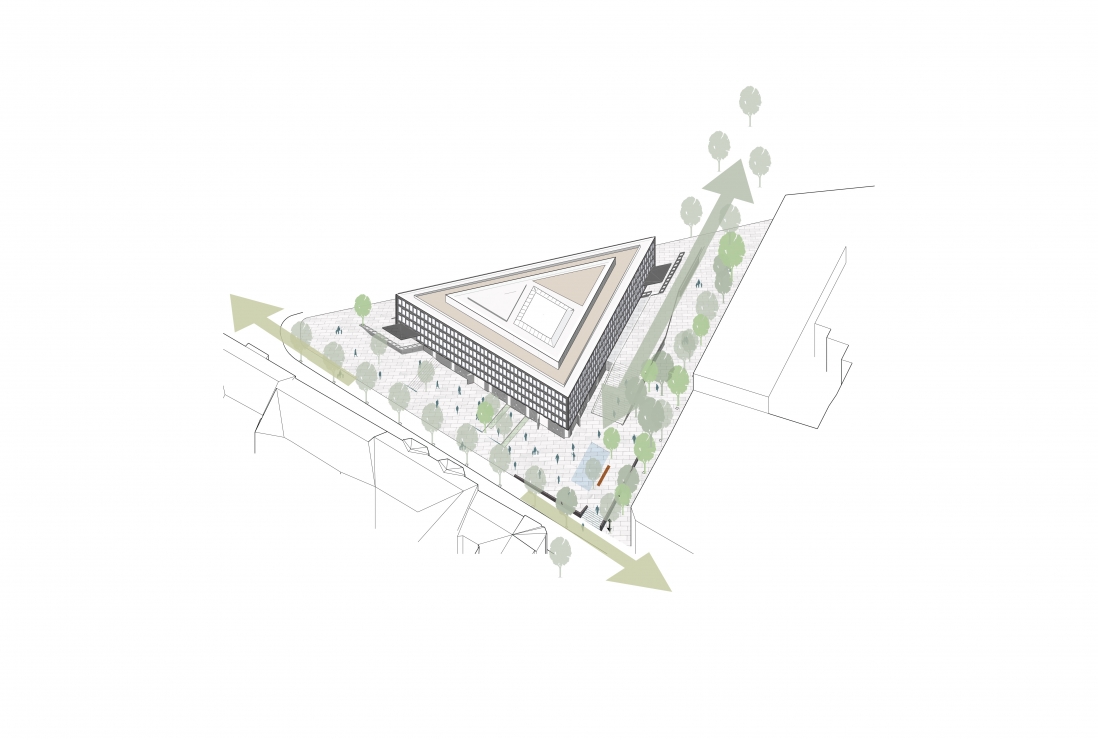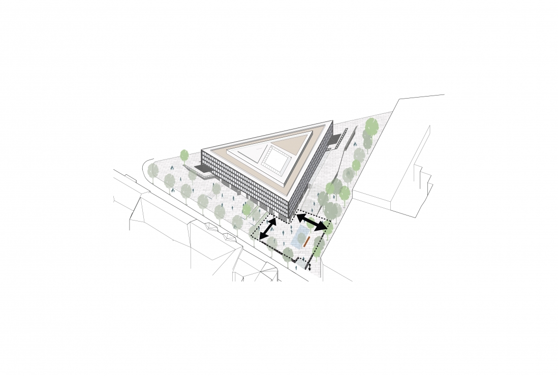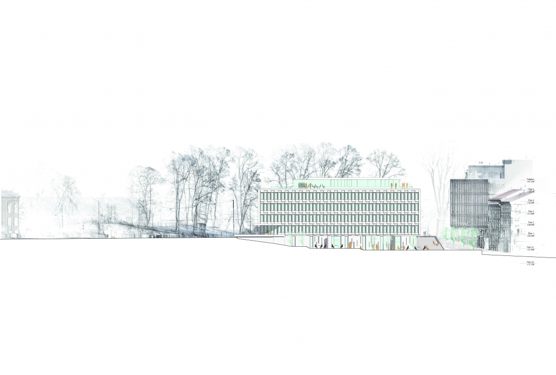 Løsningen viser at store deler av bygget åpnes for publikum, Saarinens raffinerte arkitektur settes nennsomt i stand, taket bearbeides med en inntrukket takhage og etablering av Oslos råeste bar.