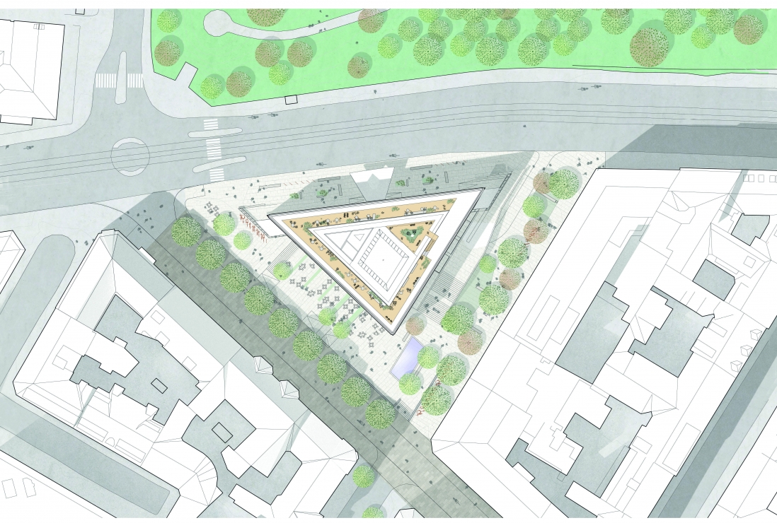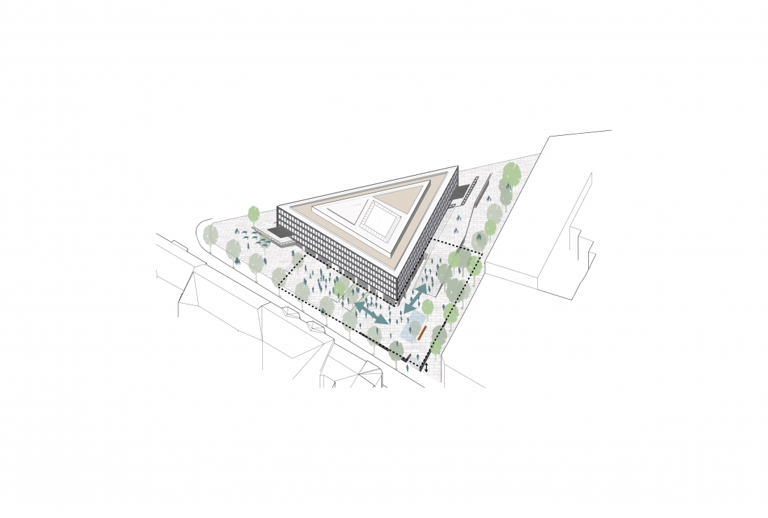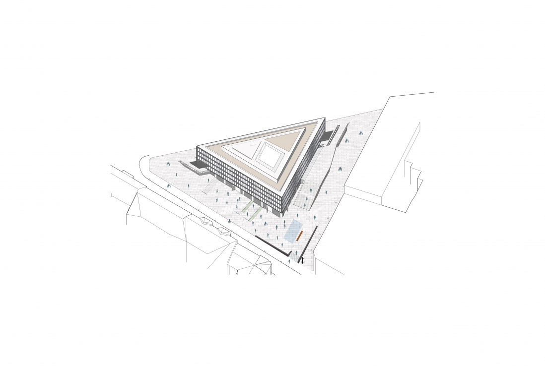 Underetasjen omgjøres til en nydelig restaurant som åpnes mot byen og en nyanlagt park med amfi, vannspeil, terrasseringer og uteservering mot sydvest.