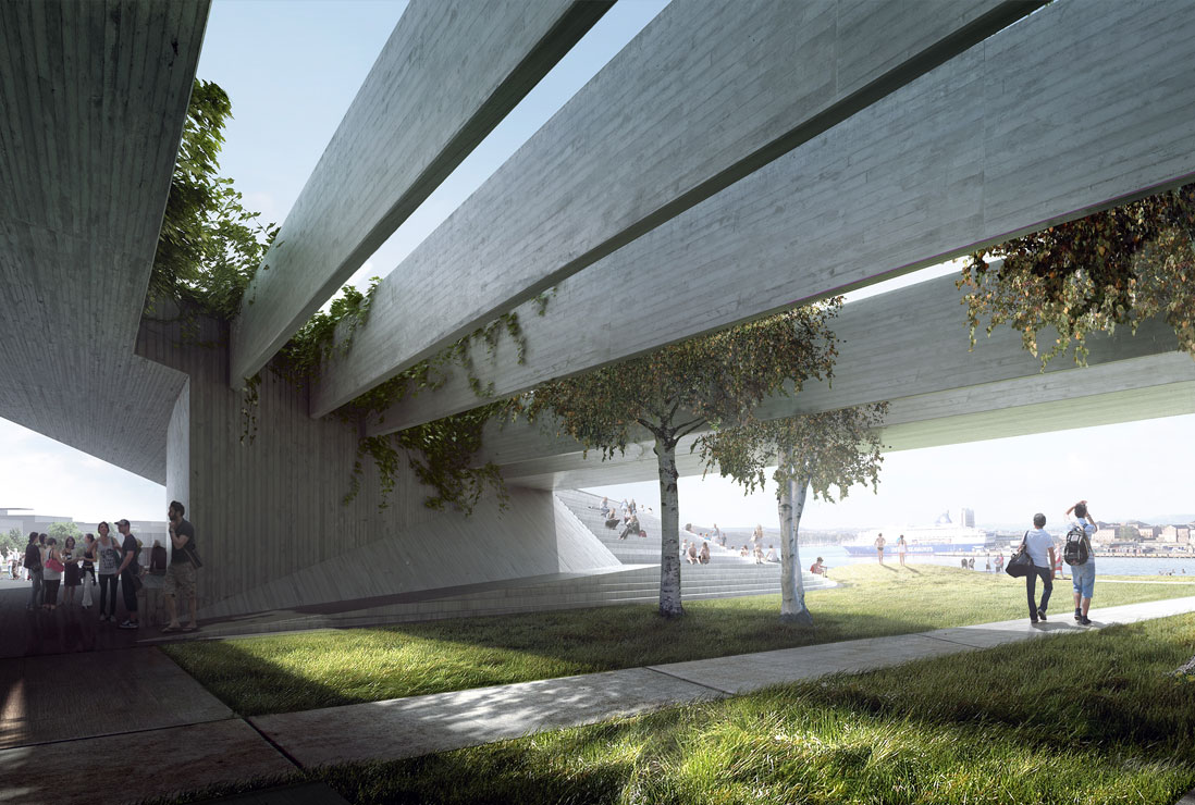 Her kan besøkende i Operaen eller Munchmuseet og turgåere ta en pause, kjøpe noe forfriskende eller godt å spise, sette seg lunt og solrikt alt etter vær og årstid, nyte omgivelsene og utsikten mot nabobyggene, fjorden, Akershus og byen. På avstand, sett fra taket på Operaen eller oppe fra en rulletrapp i Munchmuseet skal bygningen fremstå som en utvidelse av sine omgivelser. På nært hold inviterer den gjennom materialbruk og formgivning til nærhet. Man kan gå gjennom den, oppholde seg under den, sitte inntil den, på den eller gå på den.