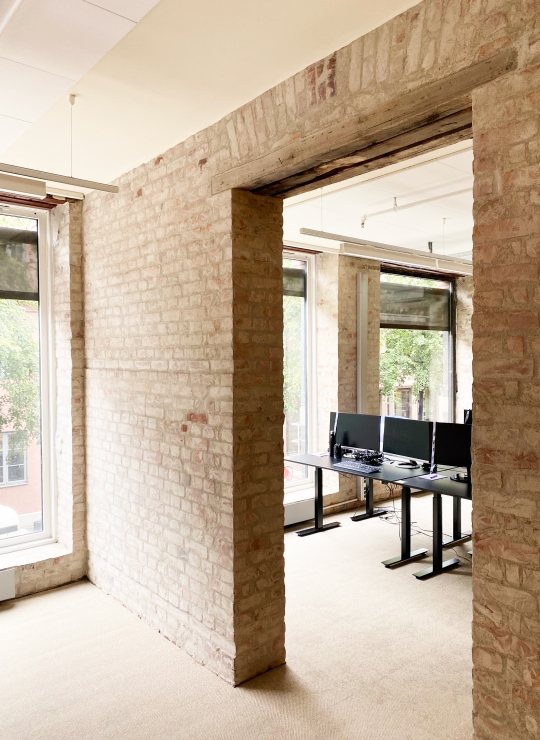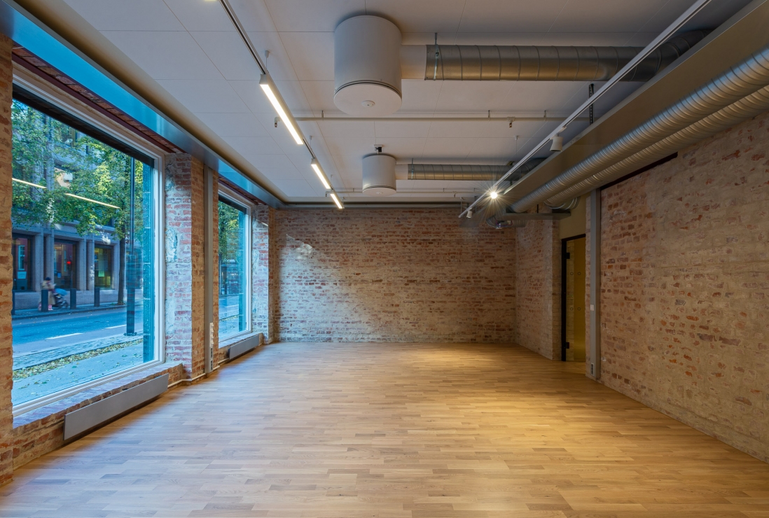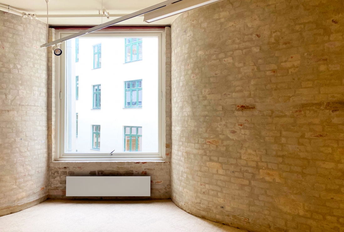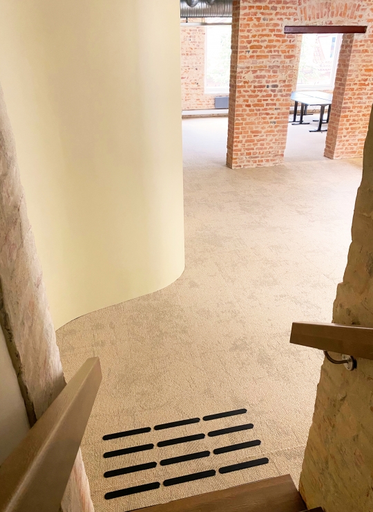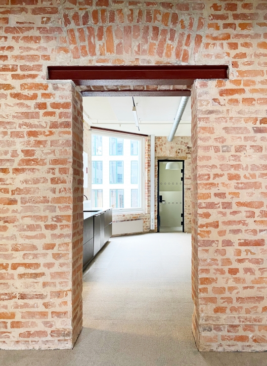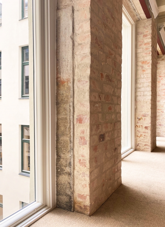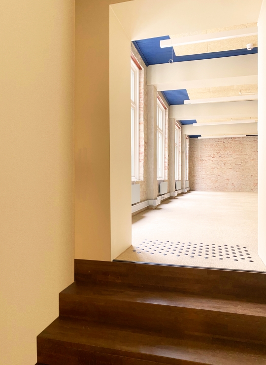 kappehvelv, og har blitt et unikt rom med kontakt ut til bakgårdens bakkeplan. Fra bakgården leder en slak trapp med trillefelt ned til kjelleren med sykkelparkering og garderobefasiliteter. Innvendig er de opprinnelige teglveggene eksponert og overflatebehandlet med tre ulike typer filsing. Dette gir rommene en varm og behagelig atmosfære sammen med fargene på de nye veggene. Et nytt hovedtrapperom med heis er etablert i nordvestfløyen for å ivareta tilgjengeligheten i bygget.
