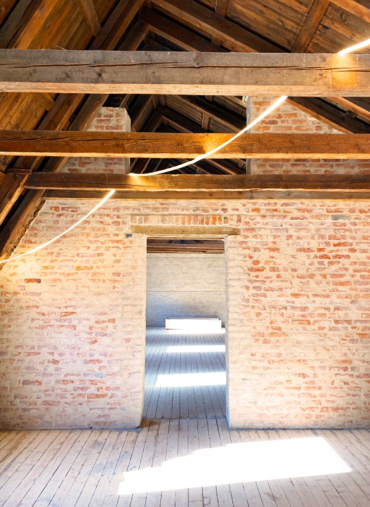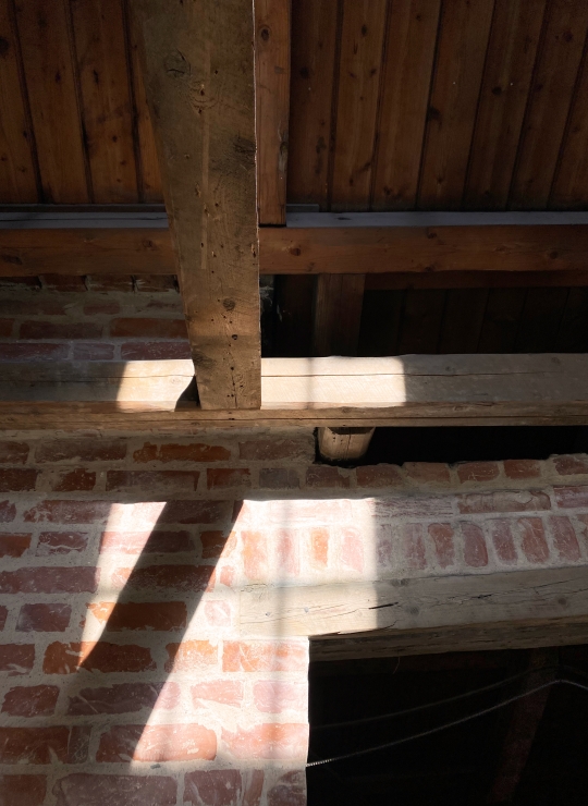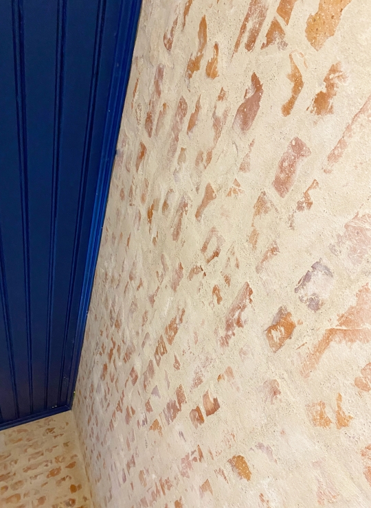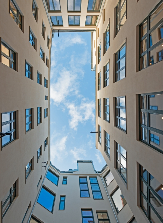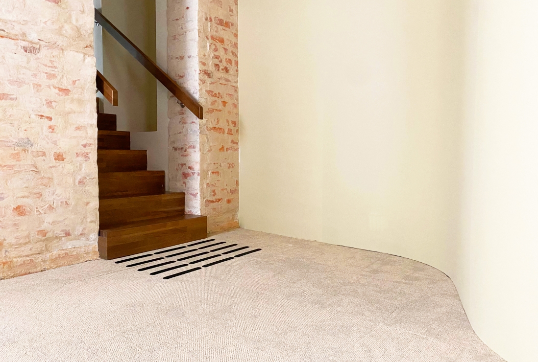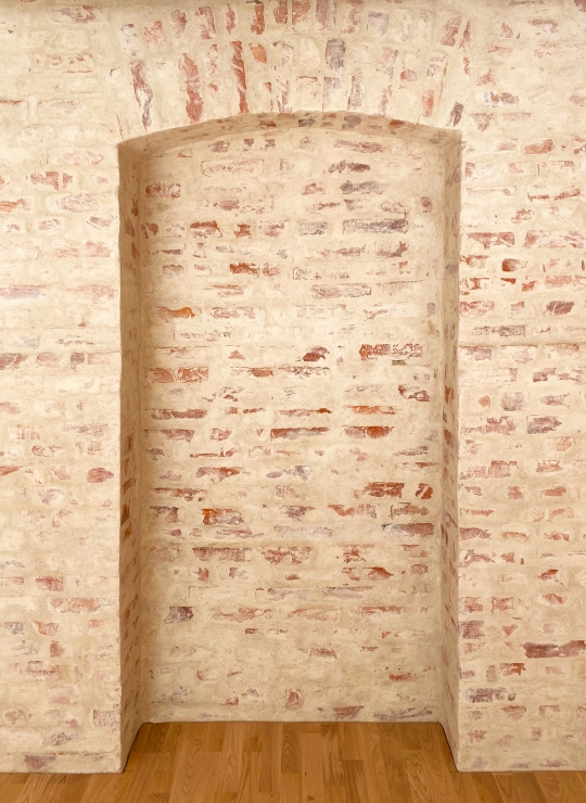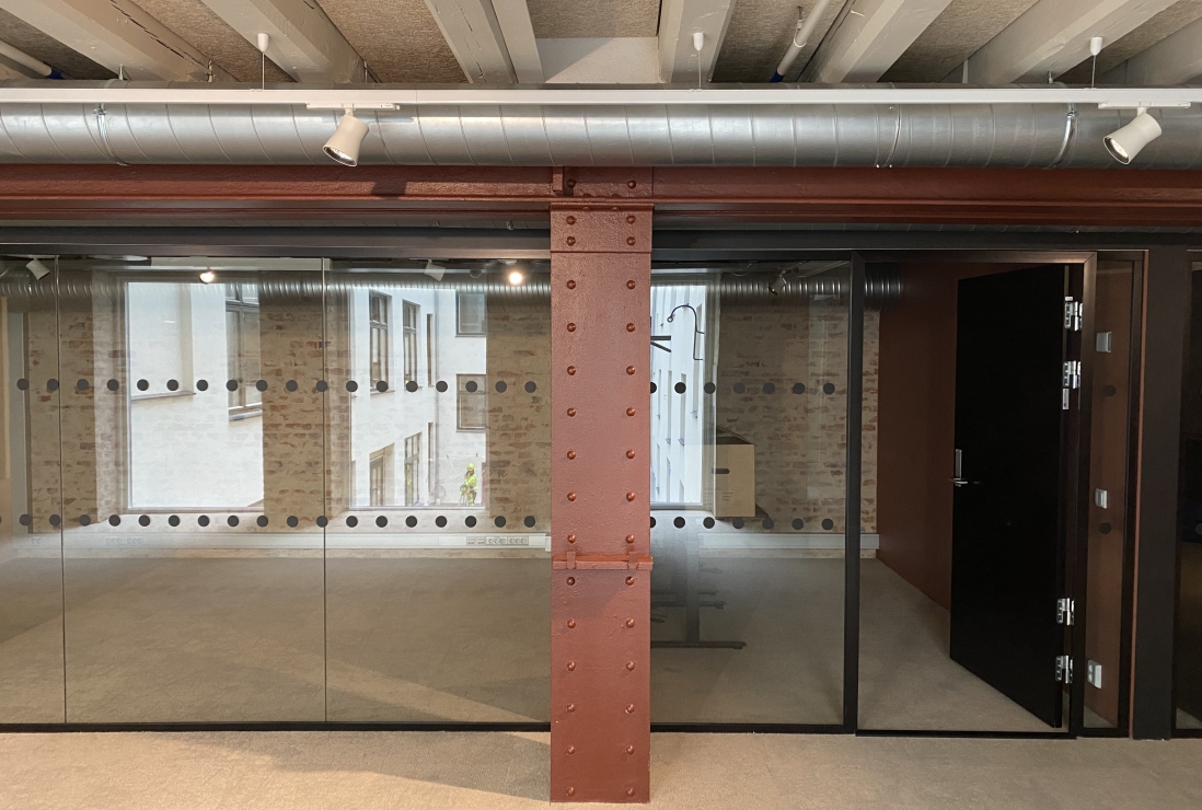 kappehvelv, og har blitt et unikt rom med kontakt ut til bakgårdens bakkeplan. Fra bakgården leder en slak trapp med trillefelt ned til kjelleren med sykkelparkering og garderobefasiliteter. Innvendig er de opprinnelige teglveggene eksponert og overflatebehandlet med tre ulike typer filsing. Dette gir rommene en varm og behagelig atmosfære sammen med fargene på de nye veggene. Et nytt hovedtrapperom med heis er etablert i nordvestfløyen for å ivareta tilgjengeligheten i bygget.