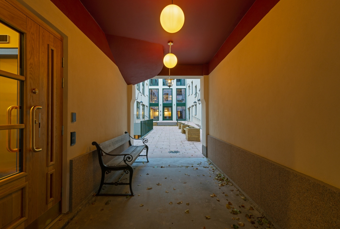 For å bedre tilgjengeligheten til bygget, har det blitt etablert nytt dekke i bakgården, med et hevet parti foran hovedadkomsten innerst i gårdsrommet. Nivåforskjellen i bakgården er benyttet til å etablere nye sitteplasser og plantekasser, og en slak rampe tar deg fra gatenivå til inngangen. Den samme granitten som allerede finnes på fasadesokkelen er brukt som nytt gulv i bakgården. Dette bidrar til å skape et lunt og fint uterom i tråd med byggets karakter. Portrommet er oppgradert med nye eikedører. Den opprinnelige stallen i 1. etasje får dobbel høyde med eksponerte trebjelker, filsede vegger og synlige