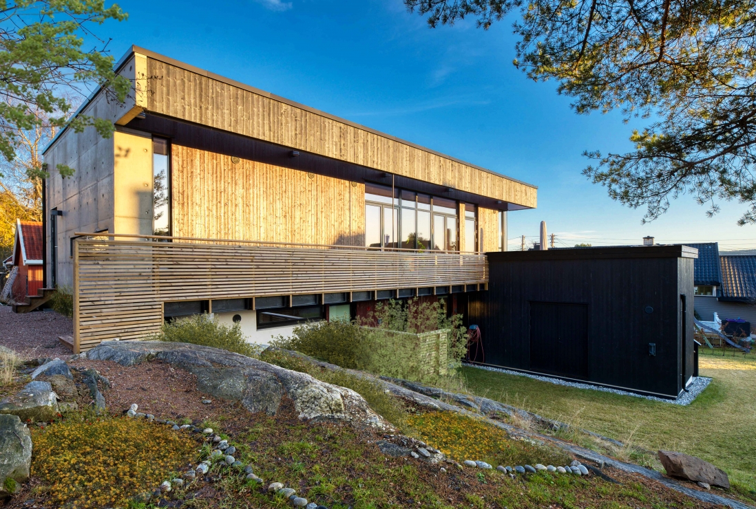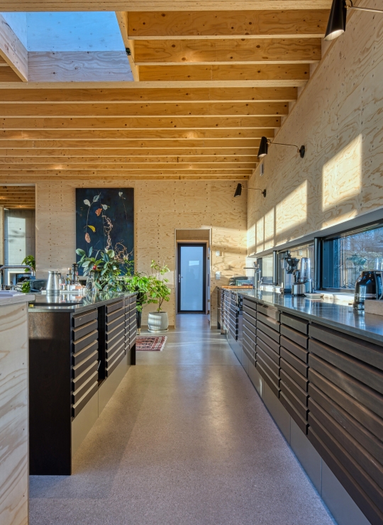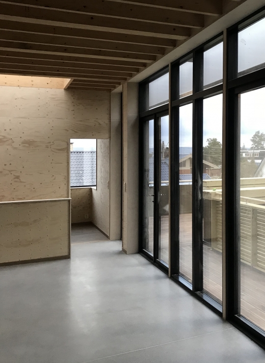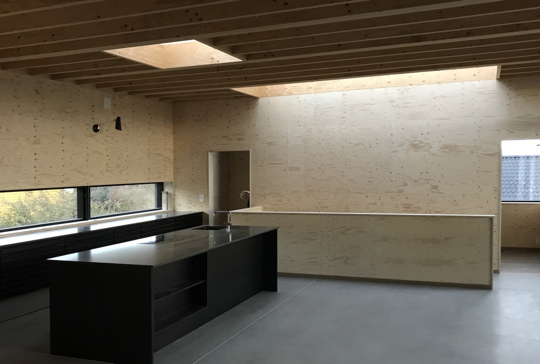 KIMA Arkitektur har tegnet en liten enebolig som ligger på Ekeberg. Bildene her er fra oppholdsrommet i 2. etg. Få materialer, overlys, god takhøyde, eksponerte konstruksjoner, åtte meter kjøkken og plass til et flygel.